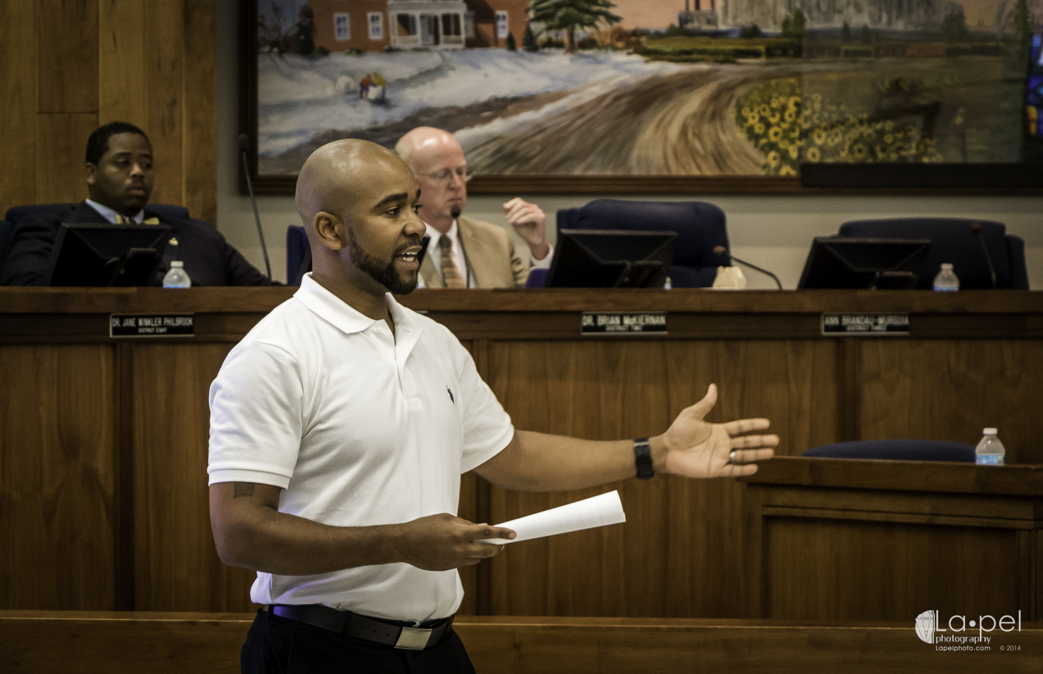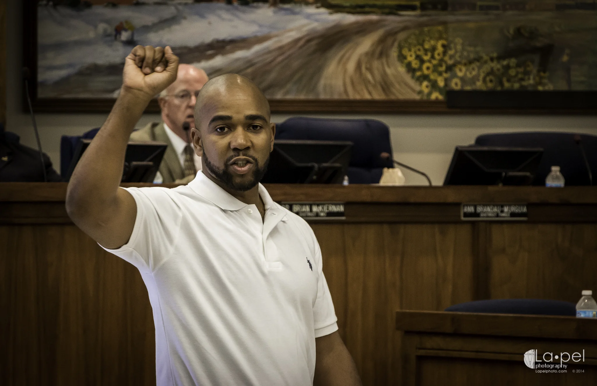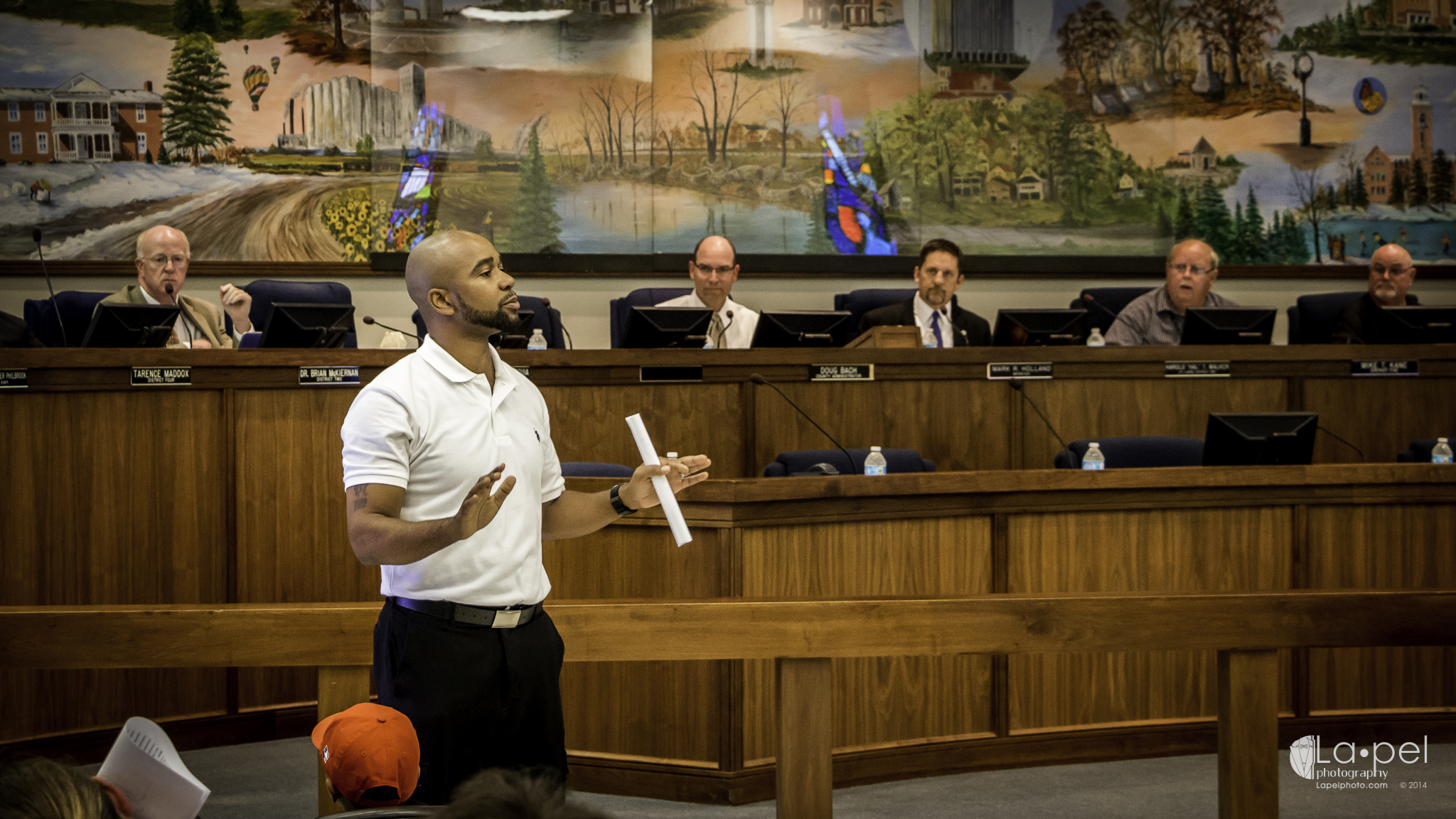 This is a photography blog, so on with the image particulars: The intent of today's images was to capture the meeting downtown in a journalistic manner. There are no heavy effects or tricks, just some concerns about exposure and the ever-pervasive etiquette. Prior to the meeting I had to inquire about the legal act of photographing the meeting. That was cleared very quickly. I was even told that I didn't have to remain seated. I was free to roam the room while in session. Before the meeting I used ETTL Flash (Yongnuo yn-568ex) to capture. There were few exposure concerns. As the meeting came into session however, I turned off the flash (even if I didn't have to) to be less of a distraction, which caused me to have to tweak the ISO for a few shots. In hind-sight I wish I had switched my camera into silent mode as well, as my shutter wasn't the quietest thing I've ever heard. All of this post's shots were shot at F4.0 to 5.6 and with the shutters at 1/125. The ISO ranged from 400 to 2000. I won't specify which ones differ. If you can tell, leave me a comment.
